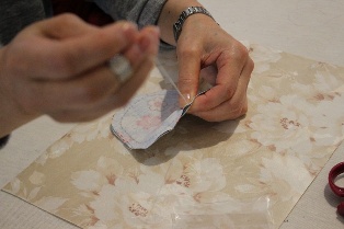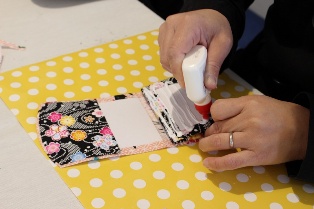 カードケースは台紙に合わせて布を切り、工程に沿ってボンドで貼り合わせて組み立てていきます。